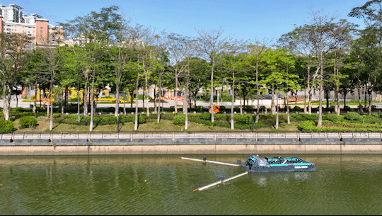 正在荔湾河涌, 无人驾驶智能洁净船动做活络、敏捷,纷歧会儿就把水面上的浮萍等垃圾收入船身下方的网兜中。垃圾 收集完后,无人驾驶洁净船从动前往泊位,城市美容师将网兜里的垃圾清运走。