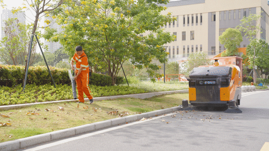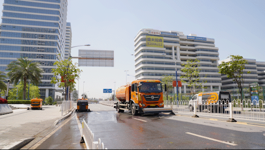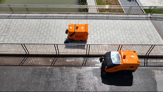 陆上, 侨银搭建的全 机械“绿能三驱”组团“出道”——高压冲刷车 将垃圾冲扫到道一侧,智能机械人紧随其后清扫马牙垃圾,面养护车协同功课,全面提拔洗街效能。正在人行道、绿化带边缘等机械盲区,智能机械人紧贴沿进行精细清扫,所经面干净一新。