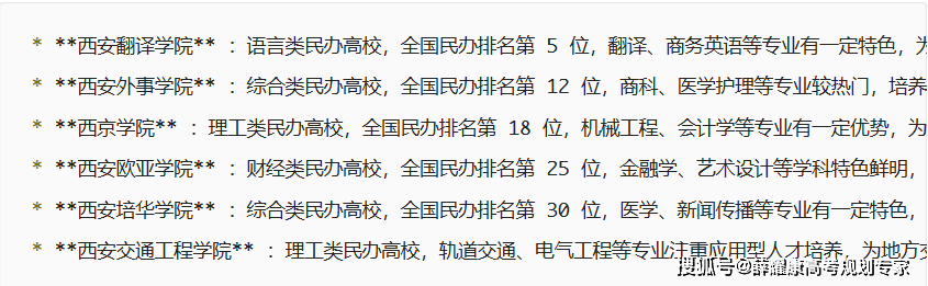 西安交通大学、西北工业大学、西北农林科技大学、西安电子科技大学、西北大学、陕西师范大学、长安大学。这是陕西的几所985或211工程院校,实力摆正在那,因为陕西地处西北,所以分数线相对于沿海地域或经济强市要低一些,这也给大师报考陕西的院校供给了优良机遇,绝对是最佳选择。西安理工大学、西安邮电大学、西北大学、西安建建科技大学、陕西科技大学、西安科技大学、西安外国语大学。这些院校也都是老牌大学,实力雄厚、师资力量强大、硬件设备齐备,有浩繁的博士硕士授权点和国度特色专业及省级沉点学科,是你报考的抱负选择。西安石油大学、西安工业大学、西安财经大学、西安医学院、陕西西医药大学。这几所院校实力也相可不雅,师资力量强大,人才辈出,学校有双聘院士、出名学者、特级传授,有国度特色专业及省级沉点学科,是你肄业的优良选择。西安工程大学、延安大学、陕西理工大学、西安医学院、西安航空学院、西安美术学院、西安体育学院。这几所院校都是通俗本科院校,建校汗青长久、学风浓重,有浩繁的学位授权点和国度特色专业及省级沉点学科,正在此深制,你的将来不是梦。宝鸡文理学院、西安文理学院、榆林学院、咸阳师范学院、安康学院、渭南师范学院、商洛学院、陕前师范学院、西京学院、西安培华学院、西安交通大学城市学院、西安翻译学院、西安欧亚学院、西安思源学院、西安交通工程学院、西安科技大学高新学院、西安财经大学行知学院、陕西国际商贸学院、西安建建科技大学华清学院、延安大学西安立异学院、陕西服拆工程学院、西北工业大学北方消息工程学院、陕西科技大学镐京学院、西北工业大学明德学院、长安大学兴华学院、西安消息职业大学、西安外事学院、西北大学现代学院、西安理工大学高科学院。这些院校实力相对偏弱,但完全能够实现你读本科的胡想,只需你肯勤奋,考研就业都没有问题,你的将来会一片。西安交通大学:分析类名校,全国排名第 12 位,C9 联盟 / 双一流 / 985 高校,能源动力、机械工程等学科处于顶尖程度,为国度科研和人才培育做出了杰出贡献。西北工业大学:理工类名校,全国排名第 25 位,航空宇航、材料科学等学科全国领先,是我国国防科技工业的主要人才培育。西安电子科技大学 :理工类高校,全国排名第 38 位,双一流 / 211 高校,消息取通信工程、计较机科学等学科实力强劲,正在电子消息范畴具有普遍影响力。西北农林科技大学:农林类高校,全国排名第 54 位,双一流 / 985 高校,农业科学、葡萄酒工程等学科特色明显,为我国农业和农村成长培育了大量专业人才。陕西师范大学:师范类高校,全国排名第 68 位,双一流 / 211 高校,教育学、中国言语文学等学科劣势较着,为处所根本教育输送了大量优良师资。长安大学:理工类高校,全国排名第 85 位,双一流 / 211 高校,交通运输工程、土木匠程等学科实力雄厚,为我邦交通范畴培育了大量专业人才。空军军医大学:医药类高校,全国排名第 90 位,211 高校,原第四军医大学,临床医学、口腔医学等学科处于顶尖程度,为我事医学和医疗卫生事业培育了大量专业人才。西北大学:分析类高校,全国排名第 64 位,具有双一流学科,考古学、地质学等学科正在全国名列前茅,为处所经济社会成长输送了大量复合型人才。西安建建科技大学:理工类高校,全国排名第 120 位,“建建老八校” 之一,土木匠程、城乡规划等学科特色明显,为建建行业培育了大量专业人才。西安理工大学:理工类高校,全国排名第 135 位,水利工程、印刷工程等学科劣势凸起,为处所制制业和工程手艺范畴输送了大量人才。陕西科技大学:理工类高校,全国排名第 150 位,轻工手艺取工程、皮革化学等学科有必然特色,为相关财产培育了大量专业手艺人才。西安邮电大学:理工类高校,全国排名第 180 位,消息取通信工程、收集平安等学科有必然劣势,为处所消息财产培育了大量人才。西安外国语大学:言语类高校,全国排名第 190 位,日语、俄语等学科正在全国排名靠前,为外事、经贸等范畴培育了大量外语人才。西安美术学院:艺术类高校,做为中国八大美院之一,美术学、设想学等学科实力强劲,为文化艺术财产培育了大量专业人才。西安音乐学院:艺术类高校,全国音乐类排名前五,正在音乐表演、做曲等范畴有必然影响力,为音乐艺术范畴培育了大量专业人才。西安石油大学:理工类高校,石油工程、地质资本等学科特色明显,为石油行业培育了大量专业手艺人才。西安工程大学:理工类高校,纺织工程、服拆设想等学科有必然劣势,为纺织服拆行业培育了大量专业人才。