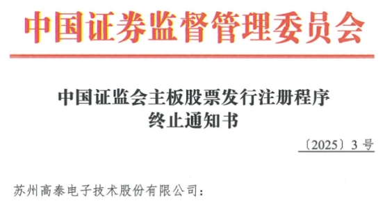 按照《中国证券监视办理委员会行政许可实施法式》第四十条及《初次公开辟行股票注册办理法子》第三十一条的,证监会决定终止高泰电子公开辟行股票并正在从板上市注册法式。