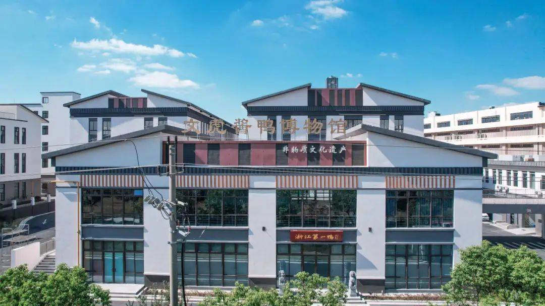 正在嘉兴文虎酱鸭股份无限公司左侧,有一座文虎酱鸭博物馆,博物馆门口,“浙江第一鸭”的匾额高悬,文虎酱鸭的企业故事、成长过程、制做过程逐个陈列正在博物馆内。